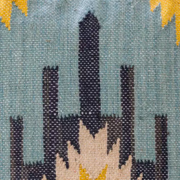This charming square jute cushion showcases warm and muted tones of ochre, blue, black and neural tones, beautifully handcrafted in India. Its durable fabric ensures the cushion is built to last, making it a lovely addition to any home decor.